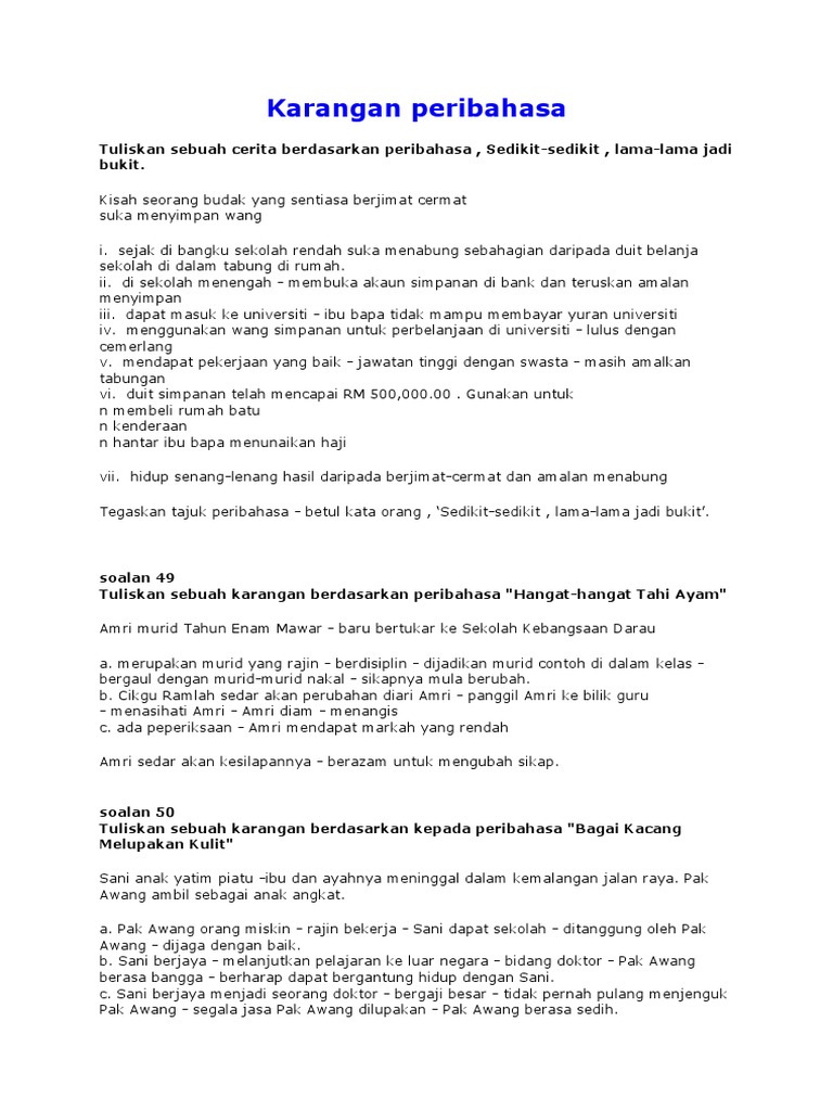 1 Karangan Peribahasa F3 Pdf Karangan Peribahasa Jenis Huraian Sedikit-sedikit lama-lama jadi bukit. Penutup Penutup bertujuan menyatakan tanda penghargaan dan. Pandu cermat jiwa selamat.